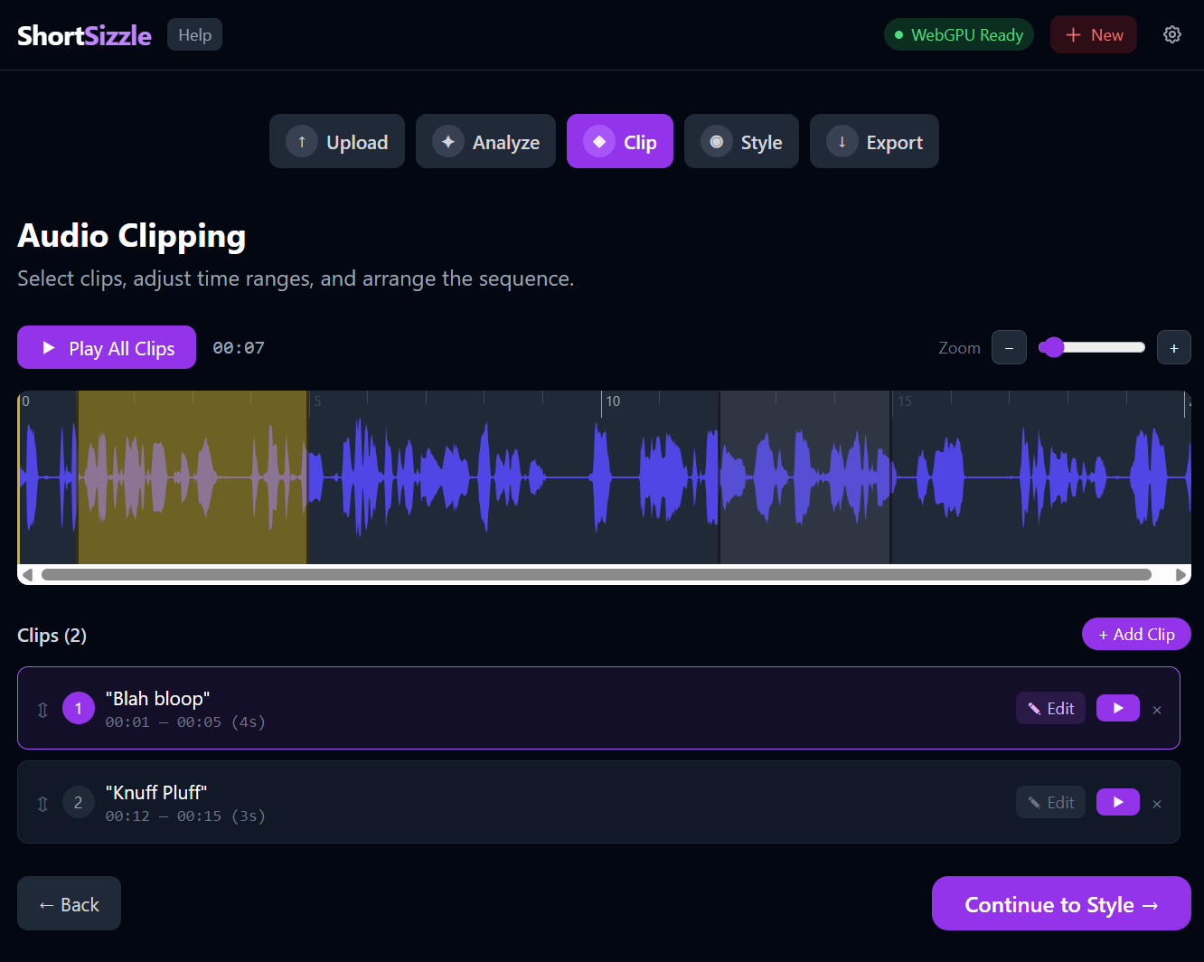 Work with clips and recombine new audio sequences. Local AI can identify most engaging passages.